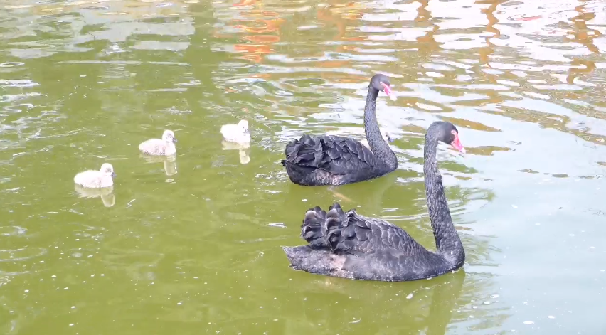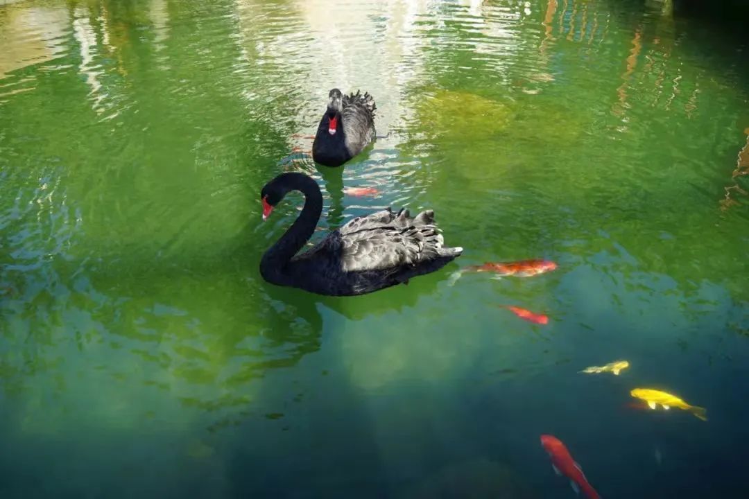 “嗨,好巧呀~” “是呀,你也在这安家啦”——看卧龙中联湖中天鹅与小金鱼们的对话
