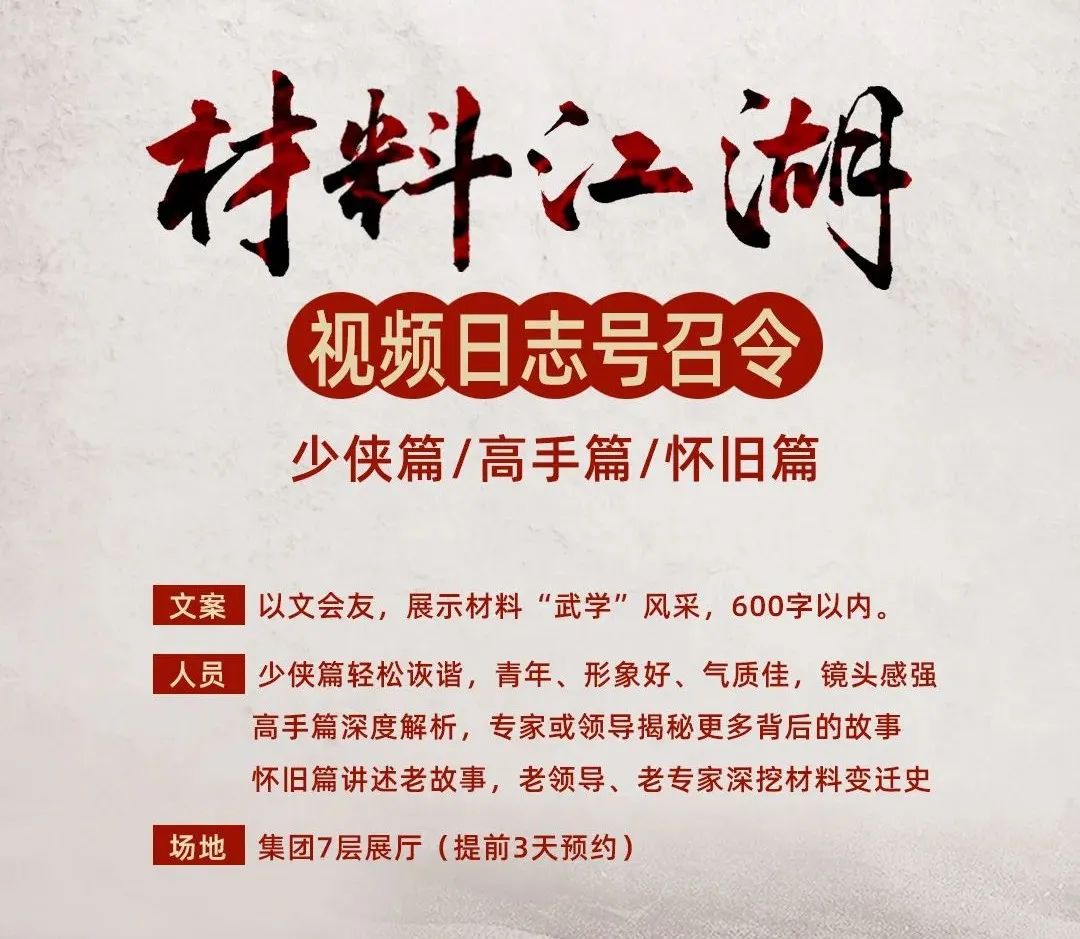 今年我们依然延续线上庆祝的方式,与以往不同的是,我们策划推出一系列视频日志——《材料江湖》,以文会友,与老专家/高手/少侠们探讨,深入解析材料“武学”奥妙,揭秘材料更多背后的故事,挖掘材料变迁历史,为大家多角度全方位地展示材料创造美好世界。
