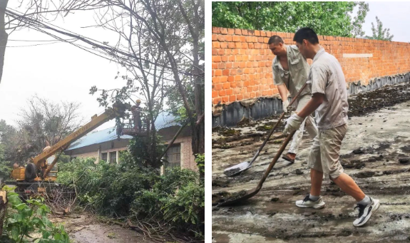 成立抗洪救灾小组,组织人员进入积水消退的龙骨车间、涂料及矿棉车间西侧,清理现场积水及泥沙,抢救物资。连续几天根据汛情与人员到岗情况,各车间陆续清理现场、清理维保设备等工作,并联系中联装备涿州机械厂,提供园区清洁、冲洗用水及两台叉车,联系电力公司,争取尽快恢复临时生活用电。
