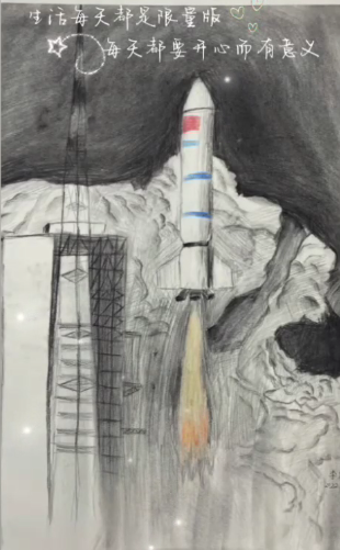 作品简介:同学的妈妈在水泥工厂工作,但他一直很喜欢妈妈工作的地方,暑假会到妈妈工作的地方玩,看到许多新奇的机器,他梦想着有一天能自己操作这些机器飞向太空,这幅作品就是孩子梦想中的火箭。