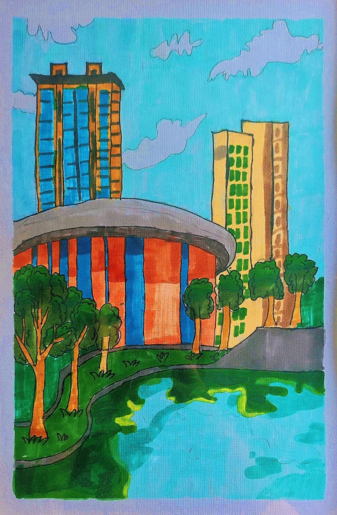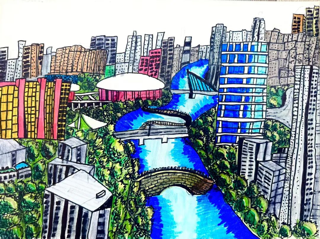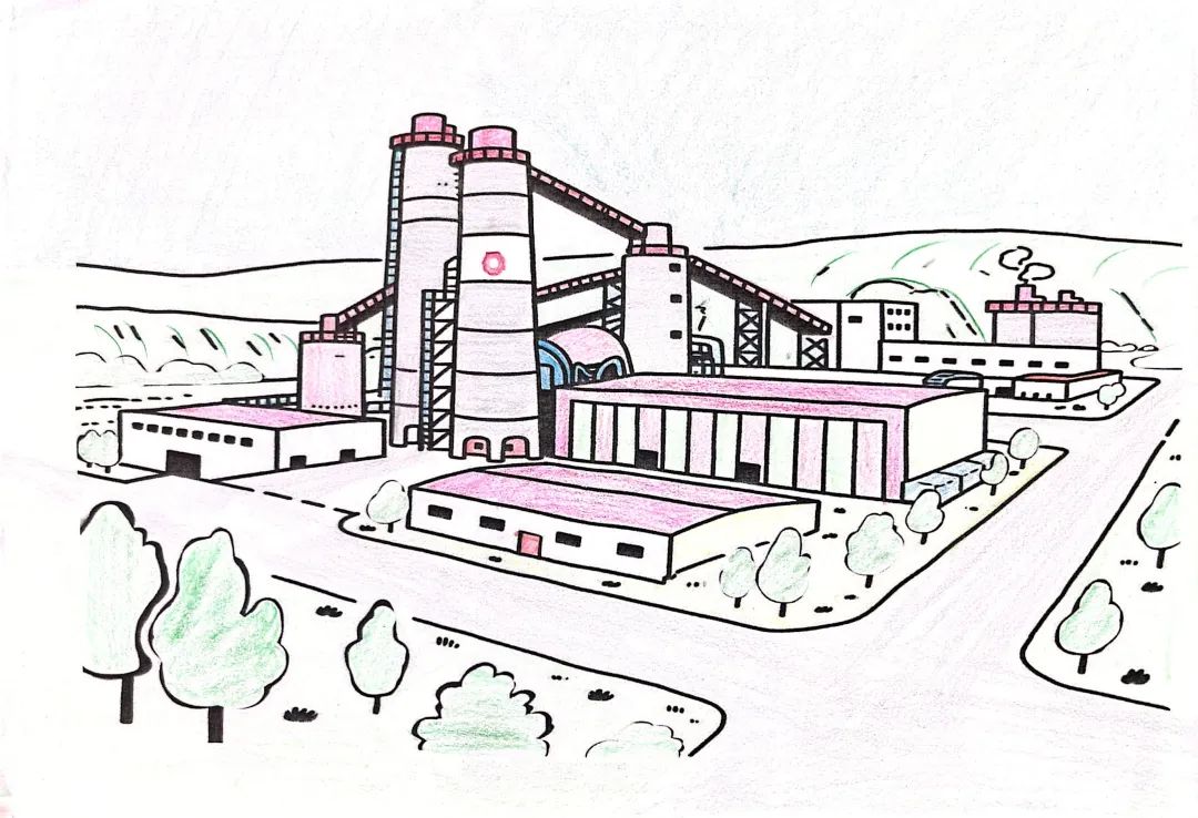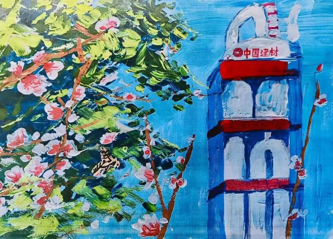 作品简介:我妈妈工作的地点是中材甘肃,那是大树环绕的绿色工厂!我用画笔记录下厂区的新面貌,蓝天下,厂房和树木和谐共生,没有灰蒙蒙的尘土,只有生机勃勃的绿色。