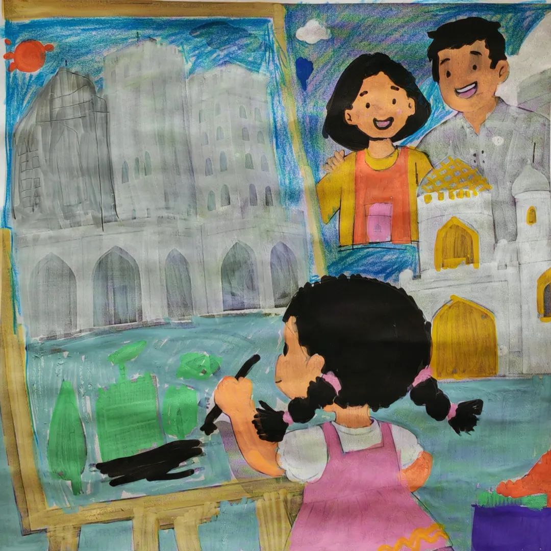 作品简介:爸爸,你看!我画的喀什东城好多楼,是不是都用了咱们天山水泥呀?父亲笑着答:当然啦,咱文化苑二期就是呀。