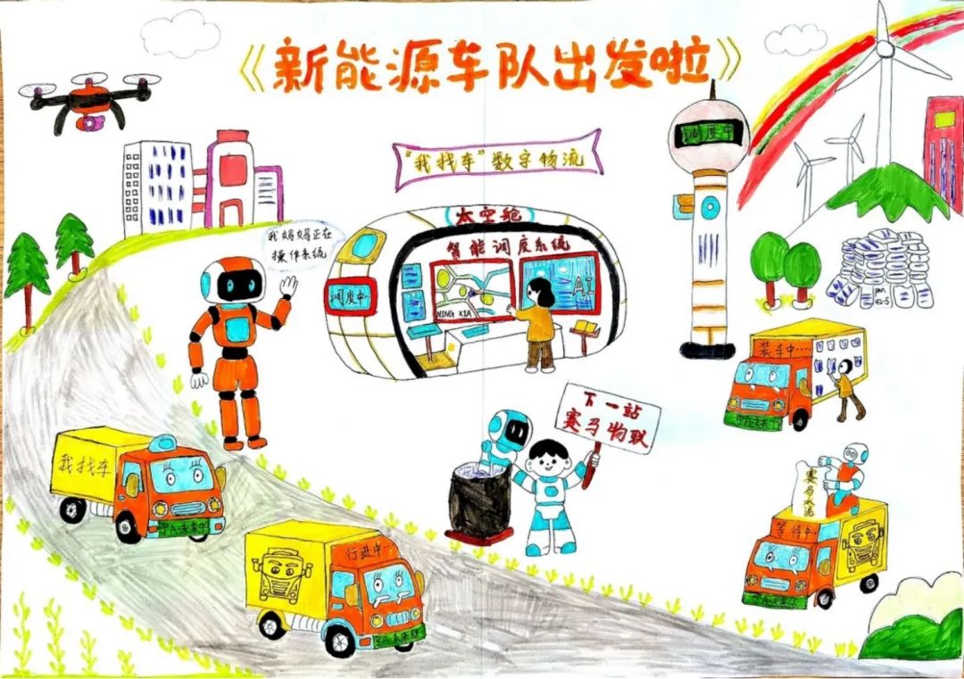 作品简介:以儿童视角描绘了未来“我找车”的发展蓝图,通过智能调度系统、新能源车队等展现“我找车”在大宗物流中的实际应用;通过新能源车、风能等元素突出节能减排、降碳等环保理念;又通过AI机器人、无人机配送等科技元素展示了“我找车”的技术实力,为客户提供高效高质的服务。