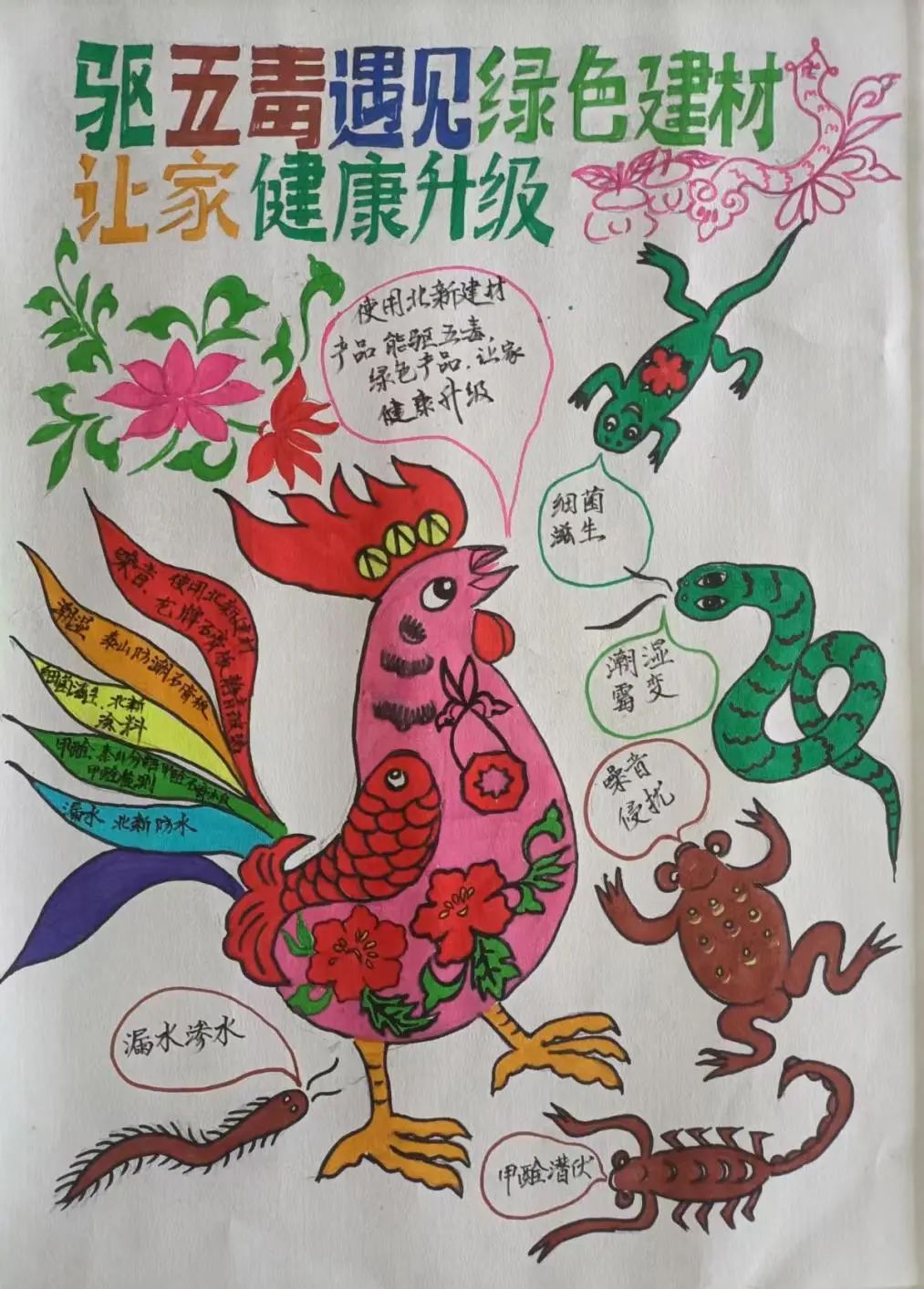 作品简介:绘画形式借用中国农民画方式,以“五毒”代表了现在的五毒,大公鸡代表了北新建材绿色产品,公鸡翅膀用鱼表示,牡丹花代表富贵大吉、年年有余,荷花代表清正廉洁、事事如意。