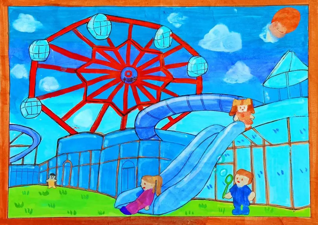 作品简介:设计理念以中国建材logo为灵感,与秦皇岛院玻璃材质相结合。红色摩天轮醒目矗立,玻璃建筑晶莹剔透,搭配蓝色滑梯。孩子们嬉戏玩耍,蓝天、白云、暖阳相伴,满是欢乐与童真。