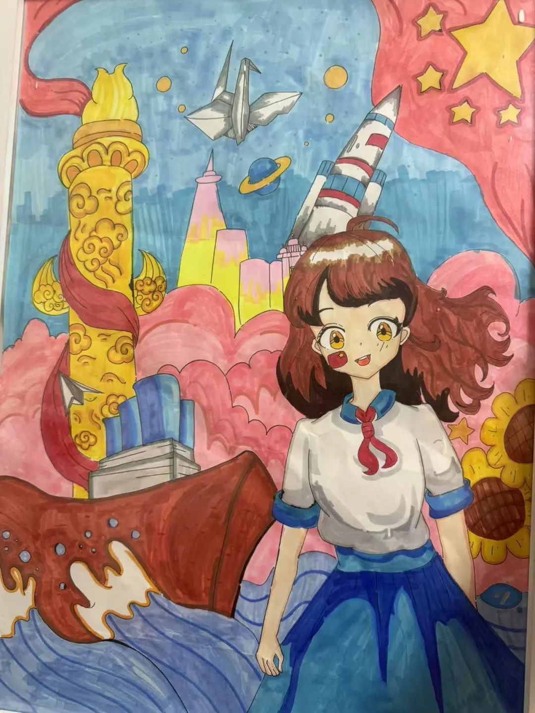 作品简介:这幅画融合了科技与建材的元素,轮船等彰显建材底蕴,火箭飞船展现科技力量;寓意创新发展,也寓意了建材走遍世界。