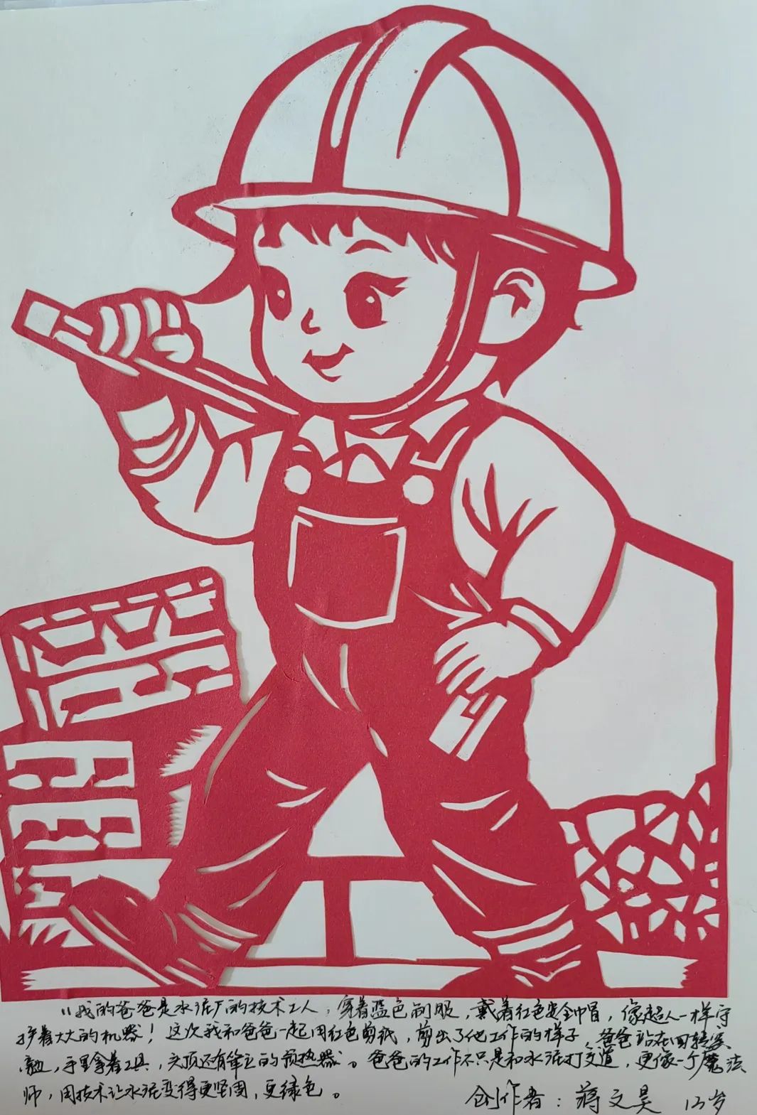 作品简介:用剪纸的形式,描绘出在技术岗位工作的爸爸。他穿着红色工作服,戴着工色安全帽,手里拿着工具,站在回转窑旁边,像超人一样守护着大大的机器。