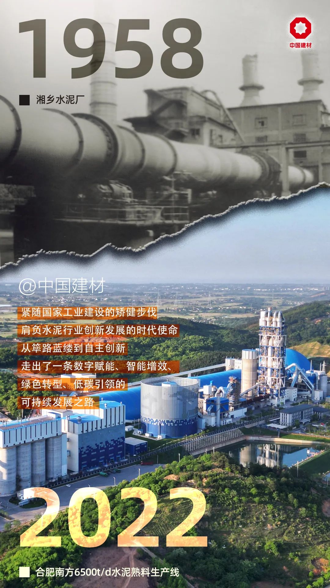 1958年筹备、1967年投产的湘乡水泥厂,是中国首个采用自制设备、自主设计并自行安装的大中型水泥厂,以国产湿法回转窑技术开创了自力更生建设水泥工业的先河,前辈们用汗水浇筑出中国水泥工业的基石。