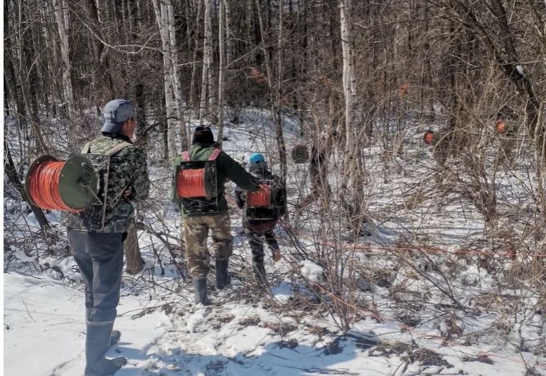 2018年12月初,正值隆冬时节。物探事业部接到野外工作任务后,第一时间组织人员,不畏严寒奔赴项目所在地。当时工作区室外温度已经达到零下25度,山上白雪皑皑,局部积雪深度达50公分以上,人员行进十分困难。施工期间,积雪经常灌入队员的鞋子里,雪融化成水,又冻成冰,一天下来,他们的鞋子冻得像冰块一样,好多队员脚上都生了冻疮。即使这样,团队成员没有一个人退缩,他们不惧严寒,顶风冒雪,克服重重困难,在林海雪原奋战了20多天,最终圆满完成工作任务。