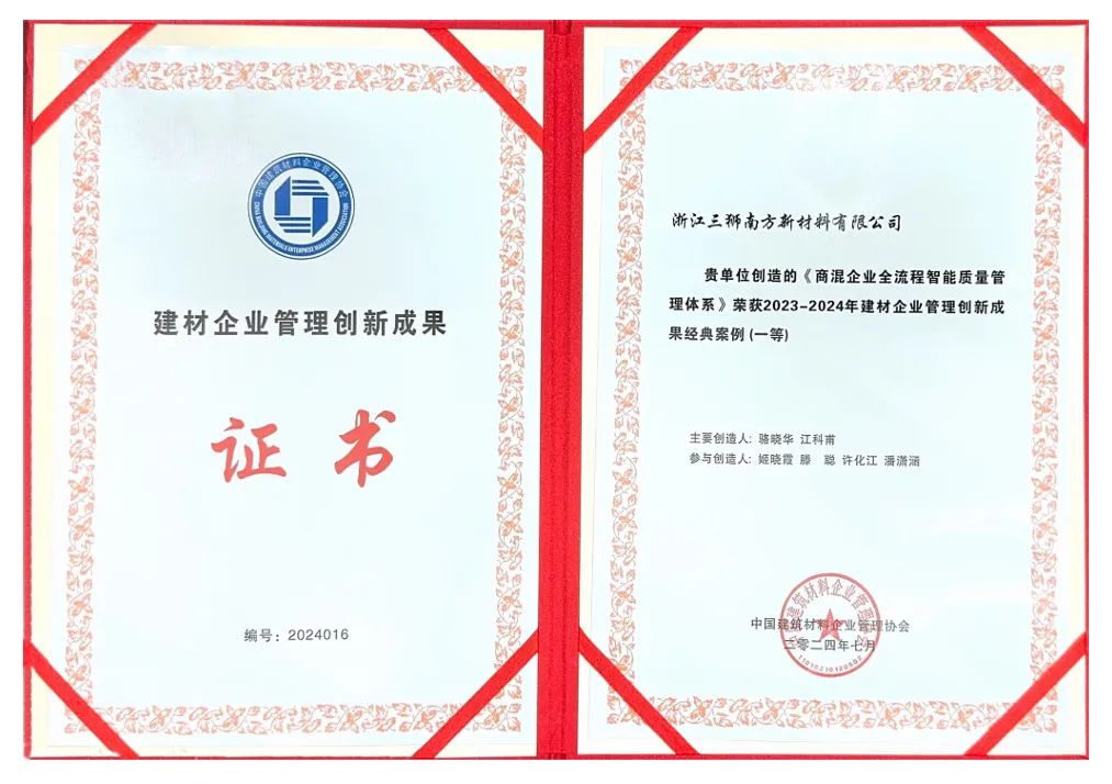 基础建材业务是中国建材的压舱石业务,突围与蝶变必须依靠转变观念,迭代升级。三狮材料深入学习贯彻党的二十届三中全会精神,始终高度重视技术研发与创新工作,坚持以自主创新引领高质量发展,坚定不移地推动行业绿色化、数字化、智能化转型升级,坚持创新驱动发展。目前,所属13家企业获评“绿色示范工厂”,获得9项《计算机软件著作权登记证书》,荣获“中国最具成长性建材企业100强”等称号,《商混企业应收账款智能风险管理体系建设》获得全国建材管理现代化一等奖、中国企业改革发展优秀成果二等奖。未来,三狮材料将持续提高央企核心竞争力,加快形成新质生产力,积极践行“材料创造美好世界”的光荣使命。