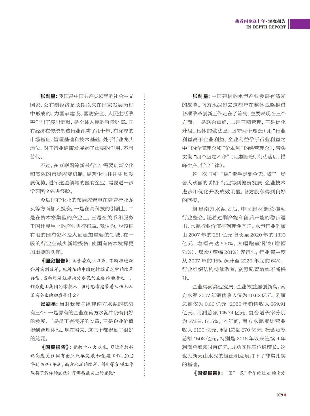 党委书记、董事长周育先表示,整合后新天山水泥的协同效应和核心竞争优势将进一步凸显,盈利能力、综合竞争力和可持续发展能力将进一步增强。“新天山水泥将建设世界一流水泥公司,引领全球水泥产业发展方向。”周育先说。 作为中国建材派驻新天山水泥的监事,张剑星和其他董事、监事肩负着体现国有资本投资公司股东意志,管理企业资本流动和收益收缴的重任。“我们将把这些年探索出的好的经验做法引入到新天山,早日把新天山水泥全方位建成业界标杆。”张剑星说。 《国资报告》:据我了解,您基本经历了中国社会主义市场经济制度从艰难探索到更加成熟定型的全过程。在您看来,两者之间的关系应该是怎样的? 张剑星:习近平总书记指出,实行公有制为主体、多种所有制经济共同发展的基本经济制度,是中国共产党确立的一项大政方针,是中国特色社会主义制度的重要组成部分,也是完善社会主义市场经济体制的必然要求。 我完全赞成这一表述。国有经济是社会主义公有制经济的重要成分,是国民经济的主导力量。民营经济是社会主义市场经济的重要组成部分,也是有益的补充。国有经济和民营经济两者不存在相互对立,没有根本矛盾的冲突,而是互为补充、共同发展、合作双赢的关系。最典型的就表现在通过混合所有制改革,国有资本与民营资本交叉持股、相互融合上。 我赞同国资委对于国有企业的分类政策,对于充分竞争的商业类国有企业,应该倡导国有经济和民营经济的混合,发挥国企优势和民企活力。 《国资报告》:您也经历了国有企业从抓大放小到优化布局的全过程。多年来,一直有观点称,国有企业应该退出竞争性领域。但实践证明,包括中国建材在内的国有企业照样可以在充分竞争领域实现很好发展。国有企业、民营企业进行产业布局的基本原则应该是什么? 张剑星:我国是中国共产党领导的社会主义国家,公有制经济是长期以来在国家发展历程中形成的,为国家建设、国防安全、人民生活改善作出了突出贡献,是全体人民的宝贵财富。国有经济在传统制造行业深耕了几十年,有深厚的市场基础、管理基础和技术基础,处于行业龙头地位,对于行业健康发展起了重要的作用,不可替代。 不过,在互联网等新兴行业,需要创新文化和高效的市场应变机制,民营企业往往更具发展优势。进军这些领域的国有企业,需要进一步学习民企先进经验。 今后国有企业的布局应着重在培育行业龙头等方面加大投资。一是在高科技的引领上,二是在资本密集型的产业上,三是在关系和服务于国计民生上的产业进行布局。我认为,应该把有限的国有资本投入到更加重要的领域,在一般的行业应减少新增投资,使国有资本发挥更加重要的功能。 长兴南方水泥有限公司美化亮化工程 《国资报告》:国资委成立以来,不断推进混合所有制改革。您所在的中国建材就是其中的改革典型。当初您是组建南方水泥的主要推动者之一。作为虎山集团的掌舵人,当时您考虑带着队伍加入国有企业的初衷是什么? 张剑星:当时我参与组建南方水泥的初衷有三个:一是原有的企业在南方水泥中仍有良好的发展,二是员工有很好的安置,三是企业价值得到合理体现。现在看来,这三个都得到了很好的兑现。 《国资报告》:党的十八大以来,习近平总书记高度关注国有企业改革发展和党建工作。2012年到2020年底,南方水泥的改革、创新等各项工作取得了怎样的成就?有哪些最突出的变化? 张剑星:中国建材的水泥产业发展有清晰的战略。南方水泥过去这些年在整体战略推进各项改革创新工作走在了前列,主要表现在三个方面:一是联合重组,二是三精管理,三是优化升级。具体的做法是:坚守两个理念(即“行业利益高于企业利益、企业利益孕于行业利益之中”的价值理念和“价本利”的经营理念),带头贯彻“四个坚定不移”(限制新增、淘汰落后、错峰生产、行业自律)。 这一次“国”“民”牵手走到今天,成了一场皆大欢喜的联姻:行业得到健康发展,企业技术进步和优化升级成效明显,各方股东得到良好的回报。 组建南方水泥之后,中国建材继续推动行业整合。随着过剩产能和落后产能的稳步退出,水泥行业价值得到理性回归。水泥行业利润由2007年的251亿元增长至2020年的1833亿元,增幅高达630%,大幅跑赢钢铁(增幅71%)、煤炭(增幅201%)等行业;行业集中度从2007年的15%跃升至2020年底的64%,行业组织结构持续改善,资源配置效率不断提升。 企业得到高速发展,企业效益屡创新高。南方水泥2007年销售收入仅为10.62亿元、利润总额仅为0.66亿元。2020年销售收入669.91亿元、利润总额145.74亿元;复合增长率分别为37.5%、51.5%。14年间,南方水泥累计营业收入5100亿元、利润总额570亿元、社会贡献总额1508亿元。特别是2018年以来连续4年利润总额超过百亿元,成功实现高位稳增长。这也为新天山水泥的组建和发展打下了非常扎实的基础。 《国资报告》:“国”“民”牵手给过去的南方水泥和现在的新天山水泥发展带来了哪些优势?虎山集团在此过程中学到了什么?您日常的时间分配是怎样的? 张剑星:此前,南方水泥通过建立央企控股的混合所有制产权结构,保持了中国建材对南方水泥的绝对控股,同时保留了联合重组进入的不同所有制股权。构建了规范的公司制和法人治理结构,有股东会、董事会、